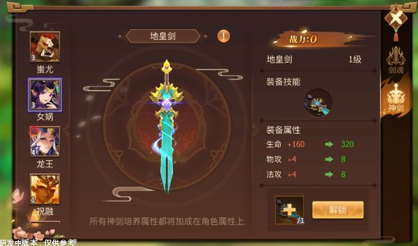 神剑对应着剑魂,图中的地皇剑就是剑灵女娲所对应的神剑。神剑和剑灵可以同时增加角色的各个属性,