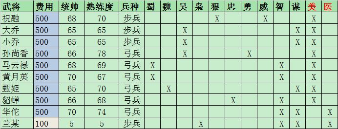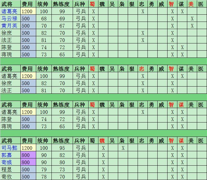 绿色武将未包含, 因为最多只能组成2个战术,价值不高.