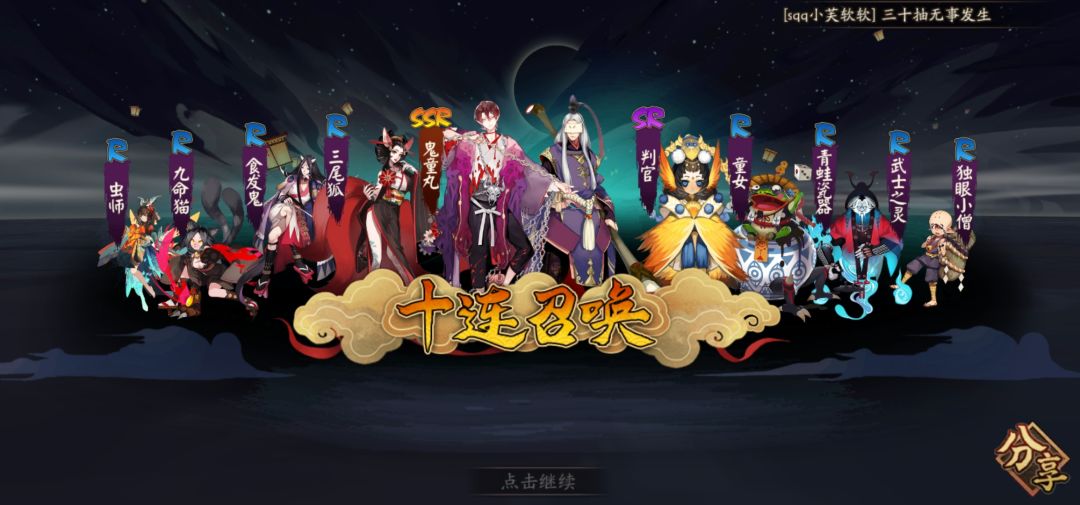 之前40抽只有几个sr。。心冷,今天11票想着单抽下,结果忘记默认十抽了。。。结果正在看着一堆r心疼是突然黑屏。。心态突然变了。。可能对比欧皇很亏,但对于自己一个只有彼岸花来讲,已经很开心了。。不欧不非吧。纪念下。。希望大家都能抽到想要的ssr(只能说这次太意外,连宠物类型都没管)(非酋成就刚完成初级的)
