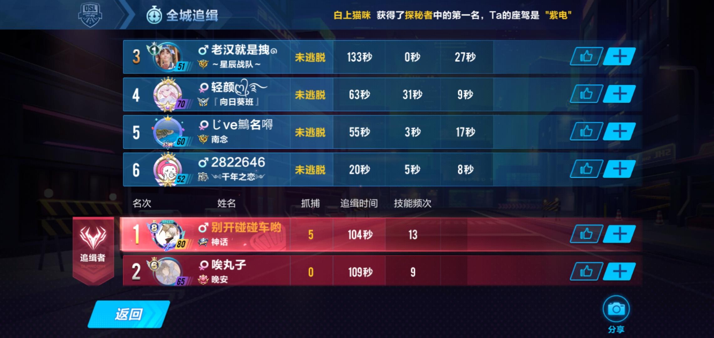 真的挺不懂这些人的,这个模式要多占点,逃出去的人才多,这么长时间,就一个人站点,其他的都找地方躲,我被一个人追了两分钟没死,另外5个人被一个人给抓完了。其次这排名机制也有问题,牵制追缉者也算实力的一种,应该把排名依据改成占点+牵制的总和。