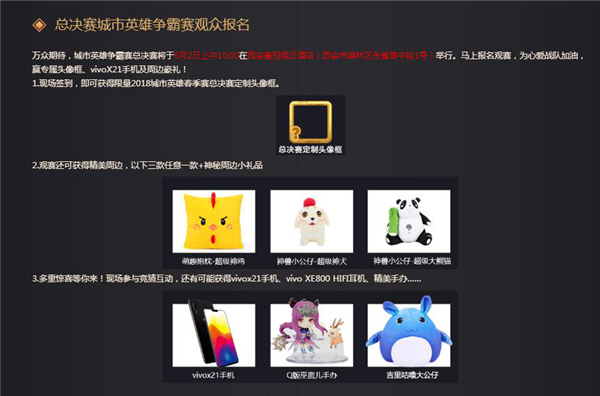 此番,全国总决赛将在位于西安市碑林区朱雀路中段1号的西安皇冠假日酒店举行,喜欢《梦幻西游》手游PVP赛事的玩家,千万不要错过这一项精彩赛事巅峰对决哦!现在,想要前往现场观赛,为喜欢的战队呐喊助威的玩家,可前往活动专题页面进行报名。届时,现场签到的玩家就能够赢取总决赛定制头像框。此外,观赛还将有机会获得超级神鸡抱枕、超级神犬小公仔、超级大熊猫小公仔和神秘周边小礼品,而现场参与竞猜互动,更有可能收获vivo X21手机、vivo XE800 HIFI耳机和精美手办。