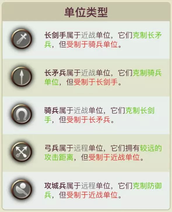 阵型相克说到底就是兵种相克,阵型的作用实际上就是让自己的强势兵种尽可能与敌方相克兵种交战。具体兵种相克规则如下: