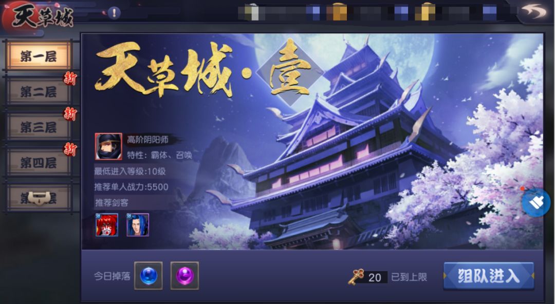 天草城目前分为五层,层数越高难度自然也就越大,毕竟是大反派的首府,没有一定实力可不要轻易去尝试呦~