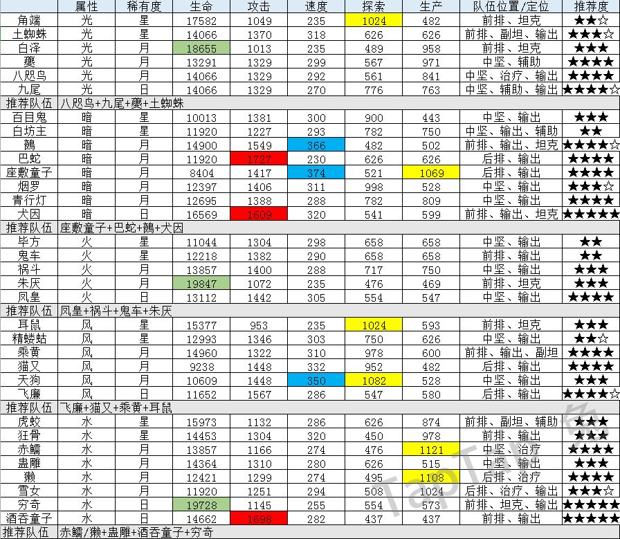 [妖恋奇谭] 全满级角色数据表及配队推荐