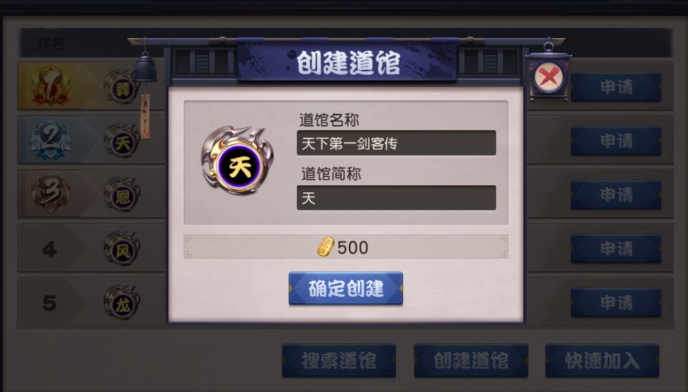 再支付500金币便可以创建属于你的剑道馆了,是时候征集众多剑客来到你的组织了!