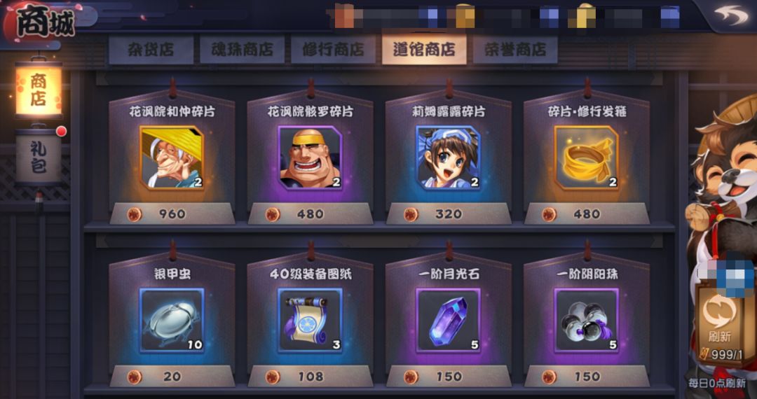资源可不是白捐献的!在道馆商店里可以消耗贡献值来兑换各个剑客的碎片以及稀有材料,道馆等级越高,可兑换的物品种类也就越多、越稀有!