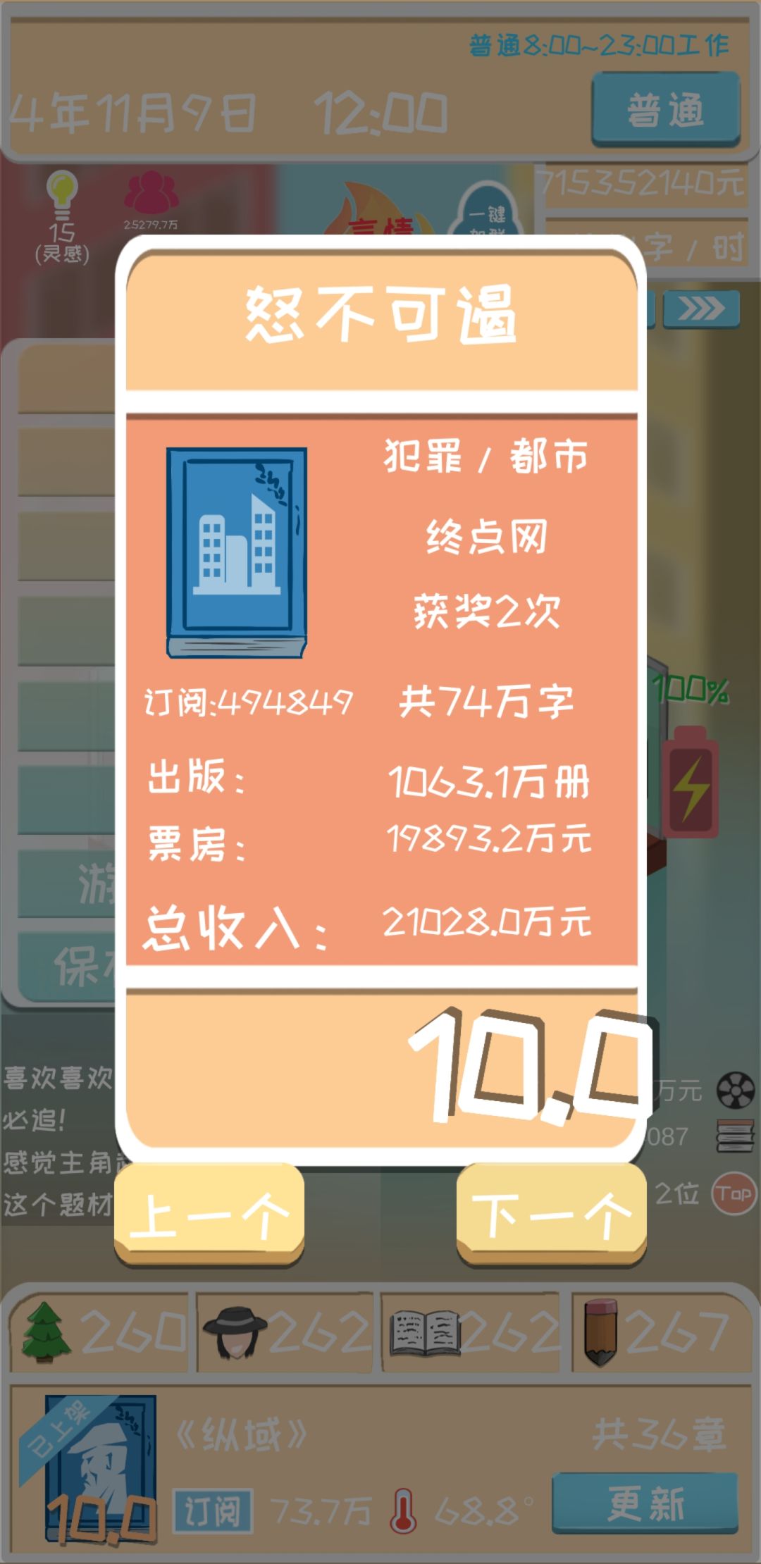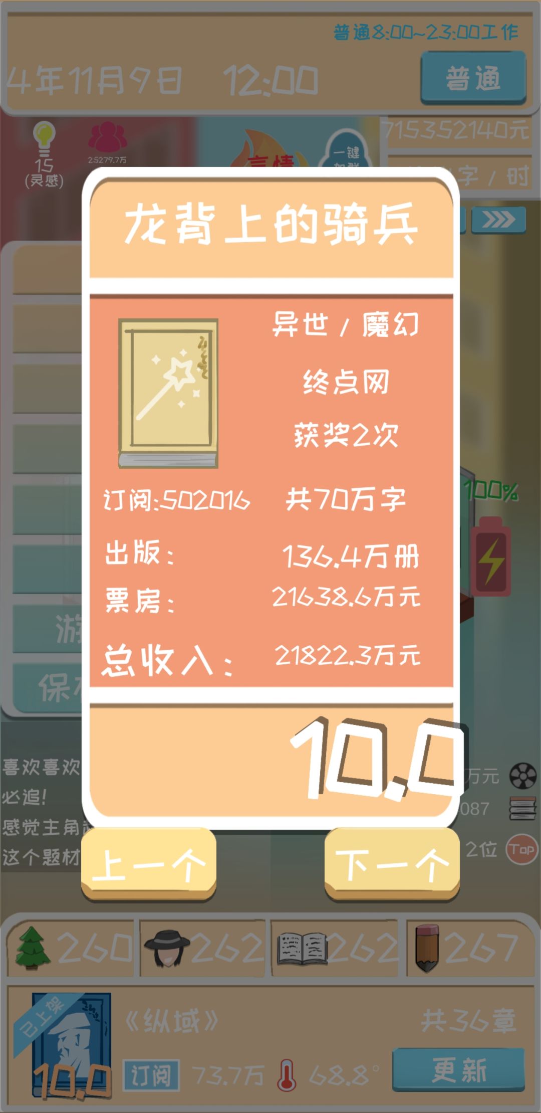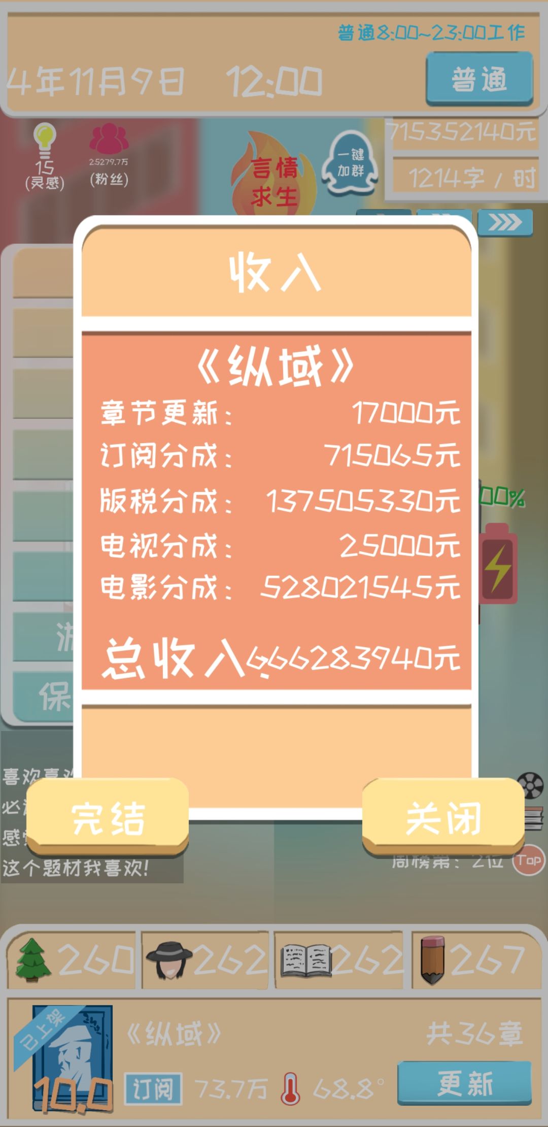 就这些了。重复重复再重复就ok了。。现在暂时不想玩这个游戏了。后期可玩性有点低。其实可以添加女友、可以增加点奢侈品的购买。租金也是。。写手难道没资格买房么。房子其实可以单独拉出来让玩家自己选择。也可以自己成立工作室招员工提供灵感产出等等增加游戏可玩性。暂时就想到这些了。。。