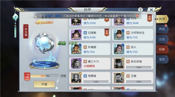 等级提升、技能提升和装备提升比较容易理解,需要依靠任务和道具去逐渐积累,神器提升以及境界的提升就不是那么容易了,可能需要我们投入较多的精力去完成一系列的任务,并且获取境界丹和黑曜石等道具才能提升。伙伴的提升主要是提升伙伴的品质和等级,当伙伴的总修为增加后也可以激活更高修为的法器加成。
