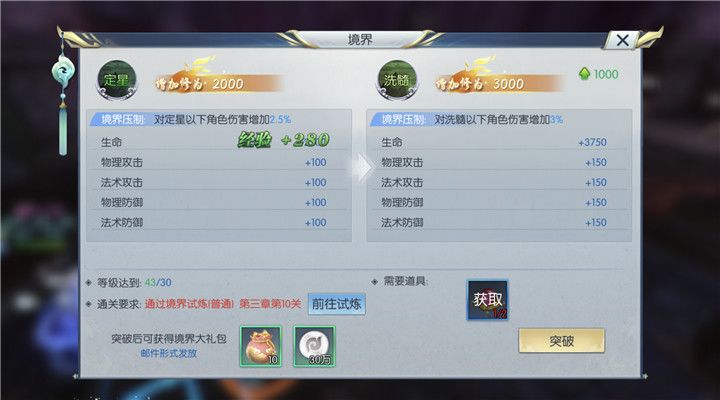 再次,在《择天记》里境界的高低决定一个人修为的高低,因此在游戏中境界的提升也至关重要,提升境界不仅能使自身的资质变强,更可以增加额外的修为。因此在55级时需要境界突破至坐照上镜,在这个境界下会有7500的境界修为加持。