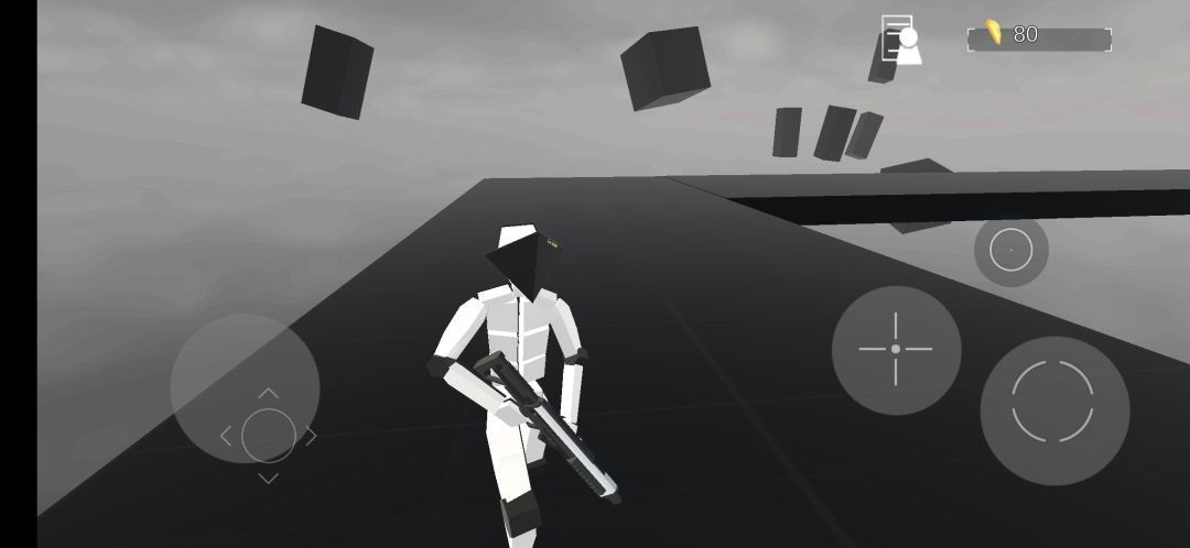 操作: 没什么好说的,左半屏移动杆,右半屏视角调整,十字按钮是射击,旁边的圆键是开镜,射击必定先开镜,单点射击键也可以开镜。右上角是钱数和状态栏状态栏打开可以看到当前子弹的权重(权重一会细讲)