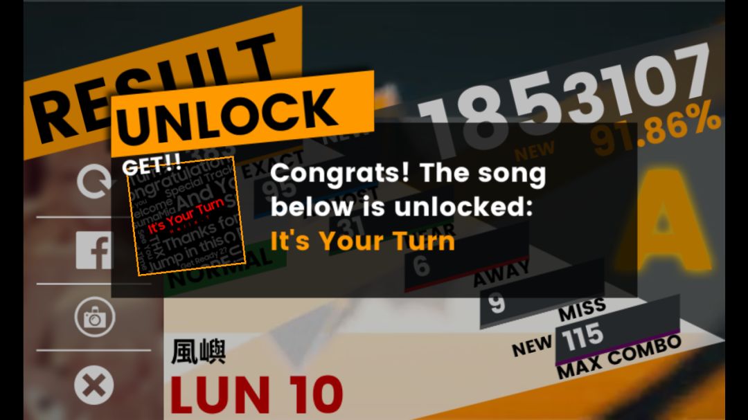 rt,当时我已经把除了《风屿》外所有歌的初始三种难度打过了,怄气爆棚地我抽到风屿然后把风屿三个难度打下来,打完之后来了这个↓