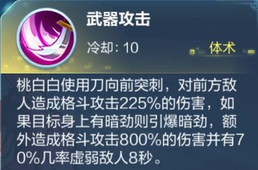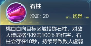 4技能,该技能拥有非常不错的释放距离和攻击范围,并且持续时间内提供虚弱状态,给桃白白一定的站撸资本,由于技能释放需要预判和比较长的前摇,给技能使用增加一定难度。