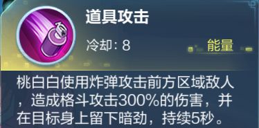 2技能,该技能可以储存3次,当攻击附带暗劲的目标伤害非常爆炸,属于桃白白的主要爆发输出技能,且技能提供比较不错的位移距离,所以桃白白的机动性可谓是非常的高。