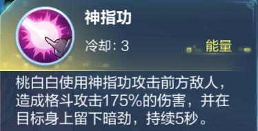3技能,指向性小范围的AOE技能,附带暗劲debuff,伤害相比神指功要高一点,可以在神指功CD情况下使用,用来保持对方身上的debuff状态。