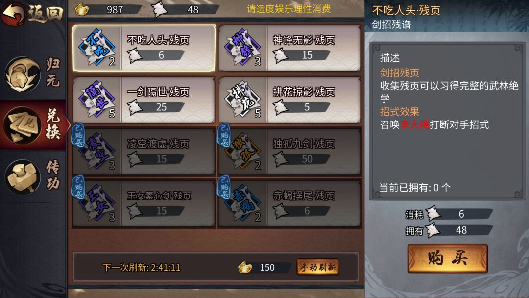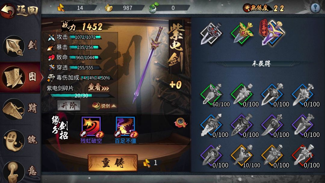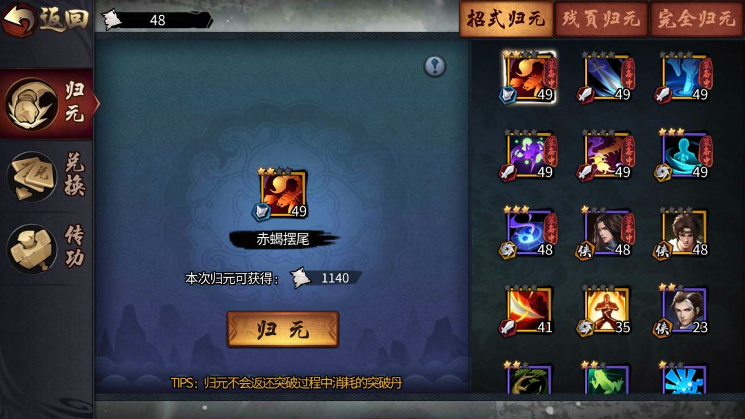 好了,前期普遍而又实用的招式都讲完了,接下来就到了招式突破的环节,游戏里的所有招式到最后都可以突破到最高的品质,也就是红招(招式品质由低到高分别为白、绿、蓝、紫、橙、红),也就是说,只要你喜欢,白招都可以突破成红招,那么,怎么进行突破呢,很简单,只要两样东西,一样是招式碎片,一样是突破丹,只要有这两样,一切都好说,那招式碎片跟突破丹怎么获得呢,先说碎片,只要你去藏剑庐抽招式,抽到相同的,就会自动转化成该招式的碎片,但是很多人都不知道,其实在招式界面,点击进入修行界面,在里面的兑换是可以用空白碎片进行已有招式的碎片兑换的(这是获得碎片的主要途径),如果空白碎片不够怎么办?点击进入归元,把升了星又不用的的招式或者那些其余的招式碎片归元,也就是分解,就会获得等量的空白碎片了,至于突破丹?紫色突破丹根本不用愁,多到用不完,橙色、红色的后面会说