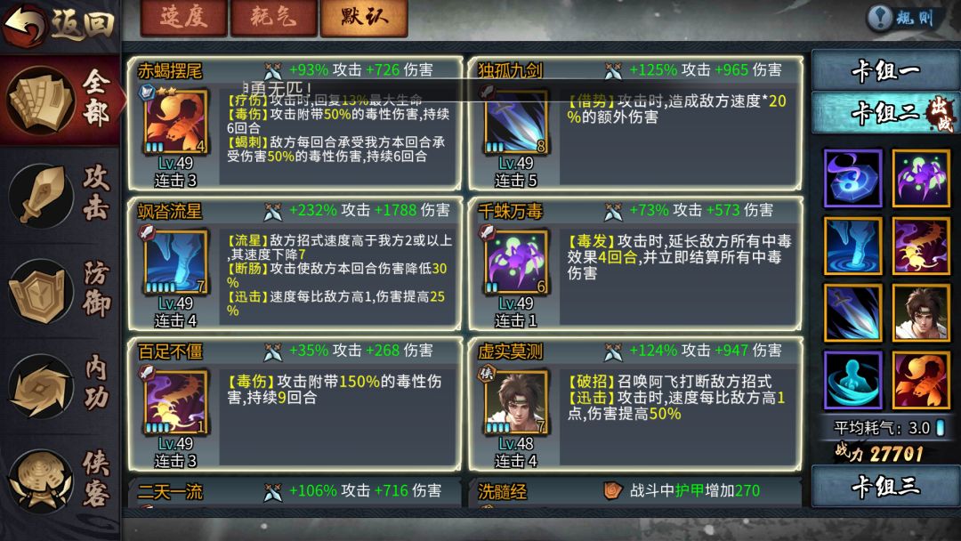 这套招式虽然不是最强的,但确实是很容易到手的,而且毒伤爆发流(蝎子、蜈蚣、蜘蛛)在前中期地位稳如磐石,所以对于新手来说是比较容易凑齐的一套组合,至于这套组合该怎么打?很简单,这套组合主打的就是蝎子、蜈蚣、蜘蛛三招,通常的打法是先手放独孤或小李,放小李是为了破掉对方的招式,并且压低对方血量(小李招式词条:每击额外造成4%敌方当前生命的伤害,越早用越好),放独孤是为了防一手对面放侠客破你的招式,而且对面速度越高,受到的伤害越高,接着就是蜈蚣、蝎子、蜘蛛依次出招,顺利的话,基本上一套就能带走对面,如果不行,就用凤舞补刀,没气就用玄玉、苍松回气