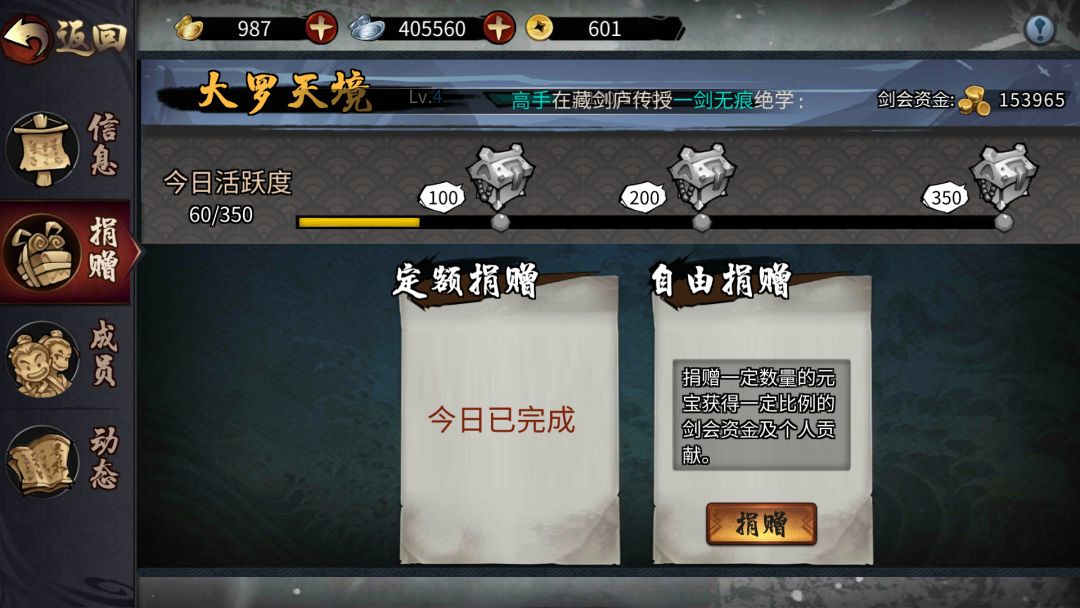 接着要说的是剑会,也就是帮会,这很重要,因为到中后期的主要材料,橙色和红色突破丹的来源就是这里,而且这里也是元宝花费的大头,每天捐赠看自己情况,能拿298元宝最高定额的就拿,不行的就30,捐赠会获得帮贡,元宝跟帮贡比例是1:10,不要省,一个橙色突破丹要8000帮贡,留着元宝干嘛,该用就用,而且除了换突破丹,剑会也有不少好东西,比如练招(增加招式基础属性)、悟招(获得招式碎片)、藏宝阁的各种材料、剑会战(也就是帮会战)等等,总之一句话总结,剑会是一个好地方