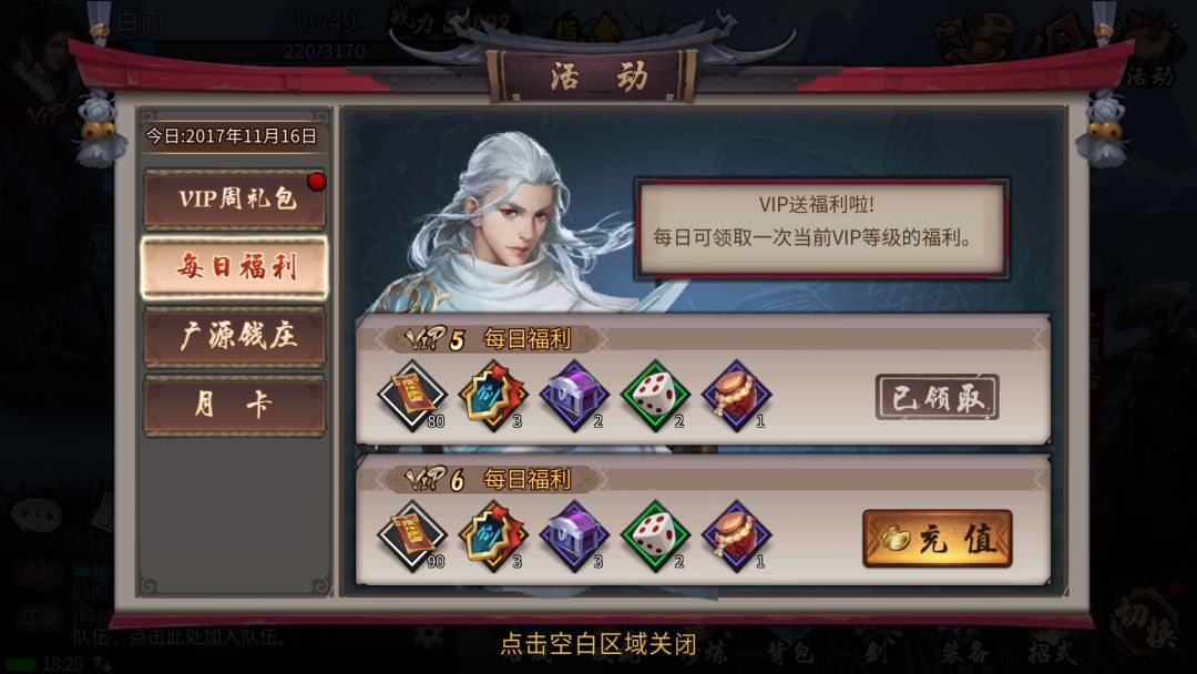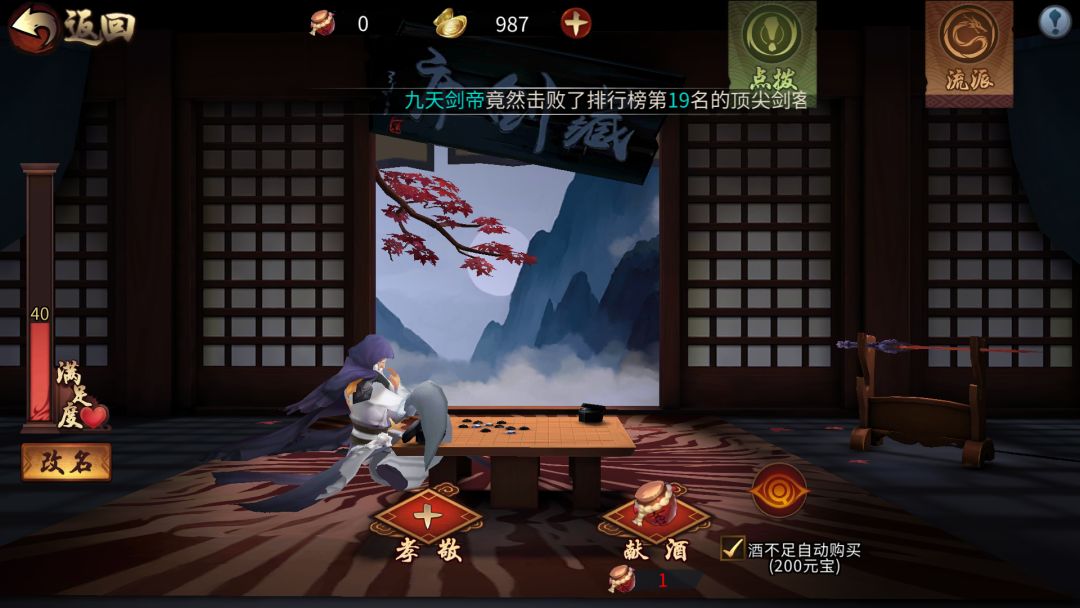 VIP(V1就有)每天都可以领一瓶酒,这瓶酒,没信仰的咸鱼们一定要攒起来,不要乱用,然后每天点击老爷爷听他口胡是可以增加好感度的,好感度满一百就必出紫招,另外,可以连续点击藏剑庐的牌匾,把它点坏,里面会掉落一招碧落黄泉,虽然没什么用,但还是聊胜于无吧,至于那些攒着的酒怎么用?当然是等活动啊,每周三更新一次活动,如果有心仪的活动,可不要错过了