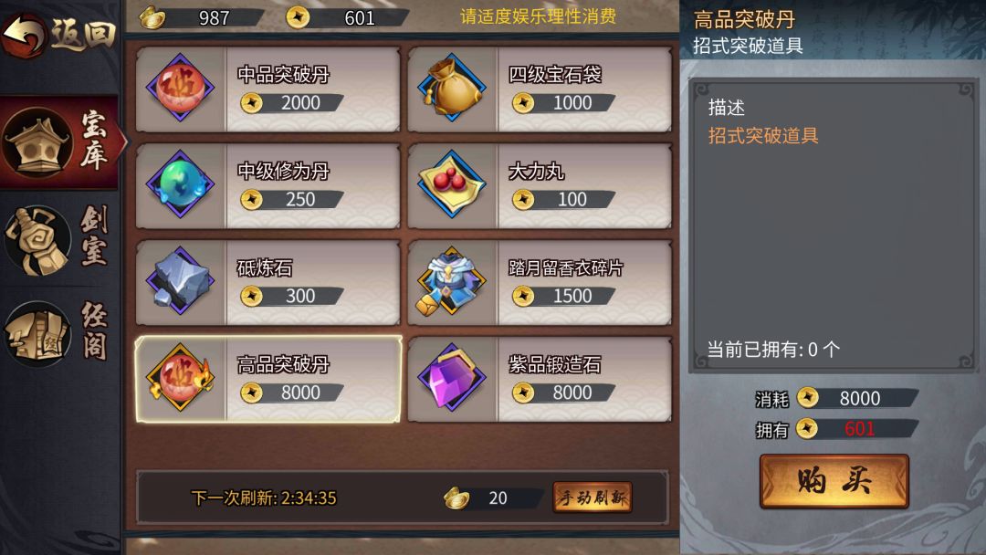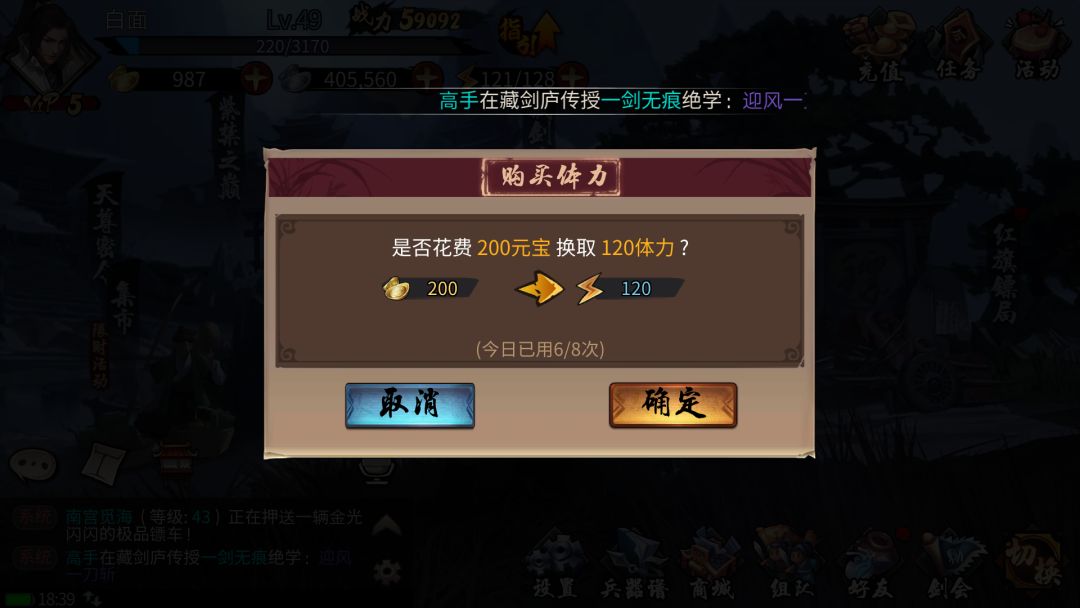 接着要说的,是这次攻略的重中之重,元宝消耗的另一大头——体力,元宝不要省,如果想要更高、更快、更强,那就必须买体力,刷剧情副本,保证你的等级不会被第一梯队甩掉,只有人物升级,才能让你的装备、招式跟着升级,才能够开启更多系统,才能够甩开那些不买体力的人,这就是想要更强的唯一办法,这个游戏,等级不是一切,还要看搭配,要看出招时机,但是等级高了,属性强了,会让你更容易击败对手,至于刷些什么副本,自然是要去刷剑魄升级所需材料的副本啦,人物与剑升级两不误,才是最佳选择,要知道,提升剑魄等级是可以增加你的真气上限的,真气有多重要我就不用多说了吧,所以,买体力是一件必不可少的消耗,还是那句话不要省,元宝该用就用