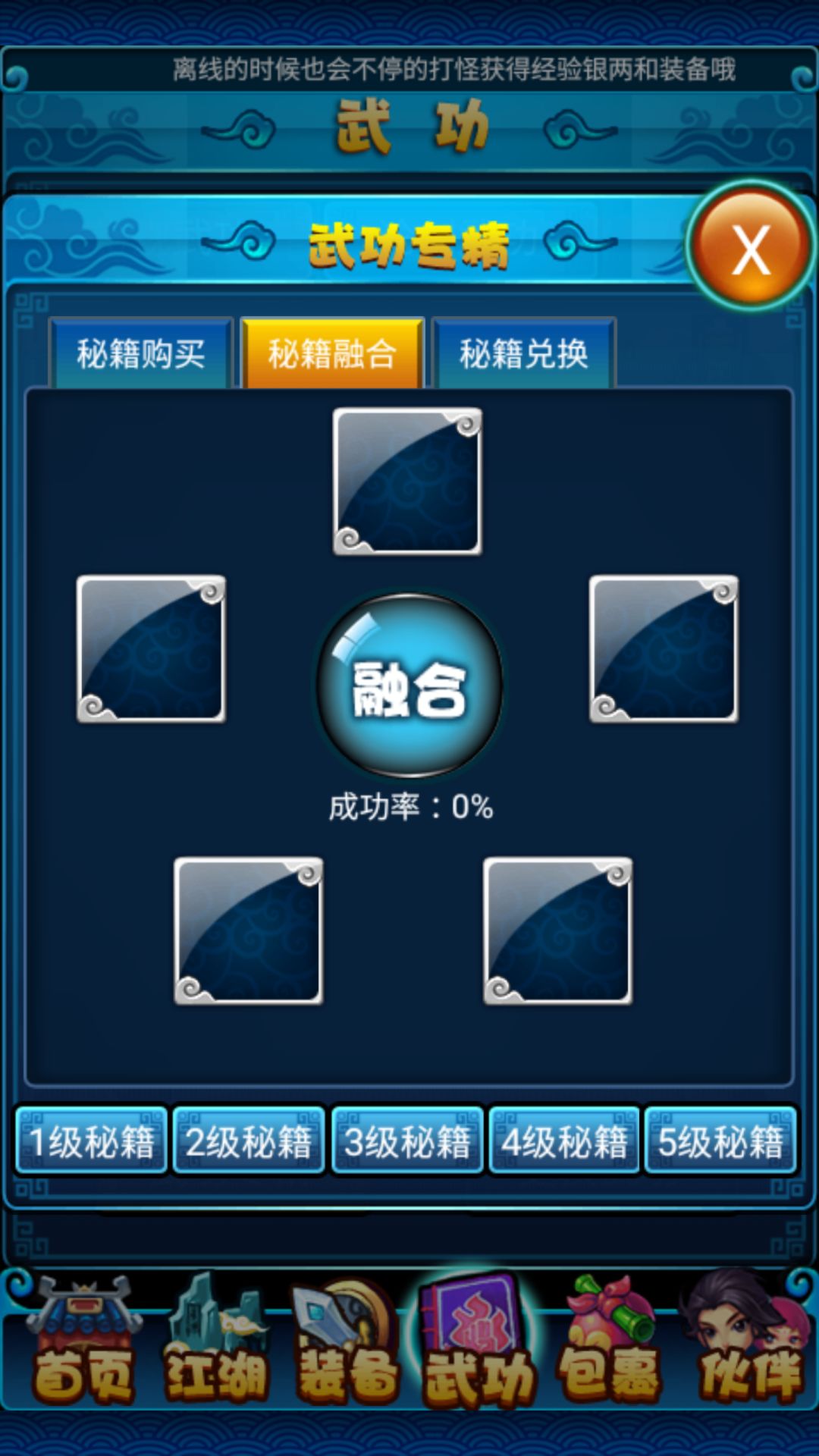 游戏中各职业拥有不同的武学传承,各有妙用,相互制衡。人物最多可装备4个武功,3级开启武功,可装备一个武功,15级开启第二个武功槽,25级开启第二个武功槽,35级开启第四个武功槽。50级开启武功专精,武功专精可抽取武功,不用的武功秘籍可用作秘籍融合获得高级武功秘籍,高级武功秘籍可强化本门武功。一次融合的同级秘籍越多,成功获得高级秘籍的几率越大,最多五本。失败将获得秘籍碎片,秘籍碎片可用于秘籍兑换中兑换本门高级武功秘籍