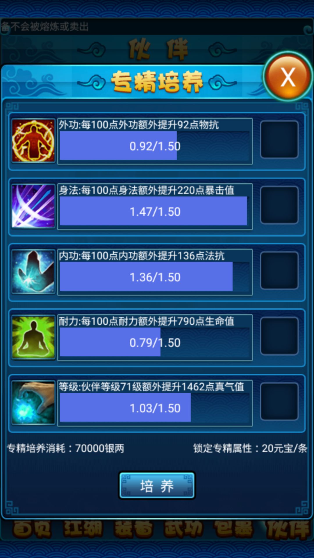 ○专精培养可根据伙伴目前的基础属性提高伙伴的更多属性,可极大提高伙伴的战斗力