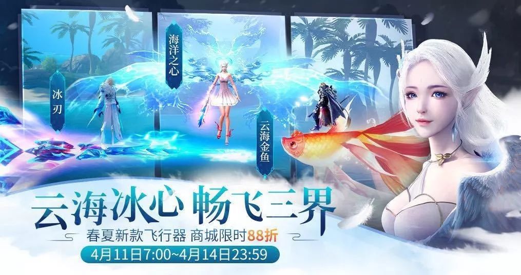 2.新品飞行器限时上架:冰刃、云海金鱼、海洋之心。上架前三天购买冰刃、云海金鱼、海洋之心永久飞行器可享受88折优惠。