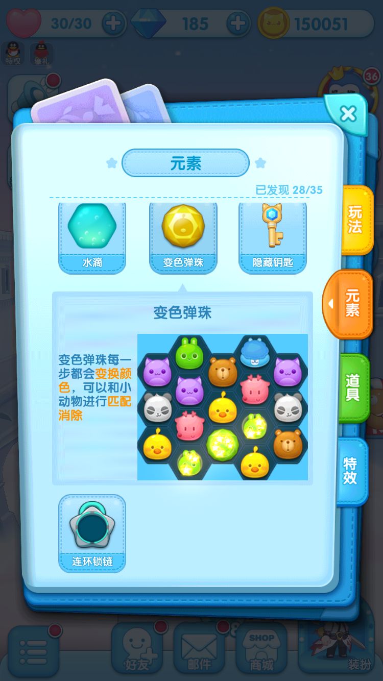 变色弹珠元素属于可消除棋子类元素,可以被交换、消除,占据棋盘上一个棋子的位置。它的外观远观和普通棋子相似,但是它完全是一个弹珠的样子,而普通棋子是小动物的形状,所以还是比较好分辨的。变色弹珠物如其名,每一回合都会变换一种颜色,并且变换颜色没有任何规律可循,完全是随机的。因此我们不能事先准备好将要消除的棋子在他附近,而是完全靠随机应变,这就给通关带来了一些挑战。
