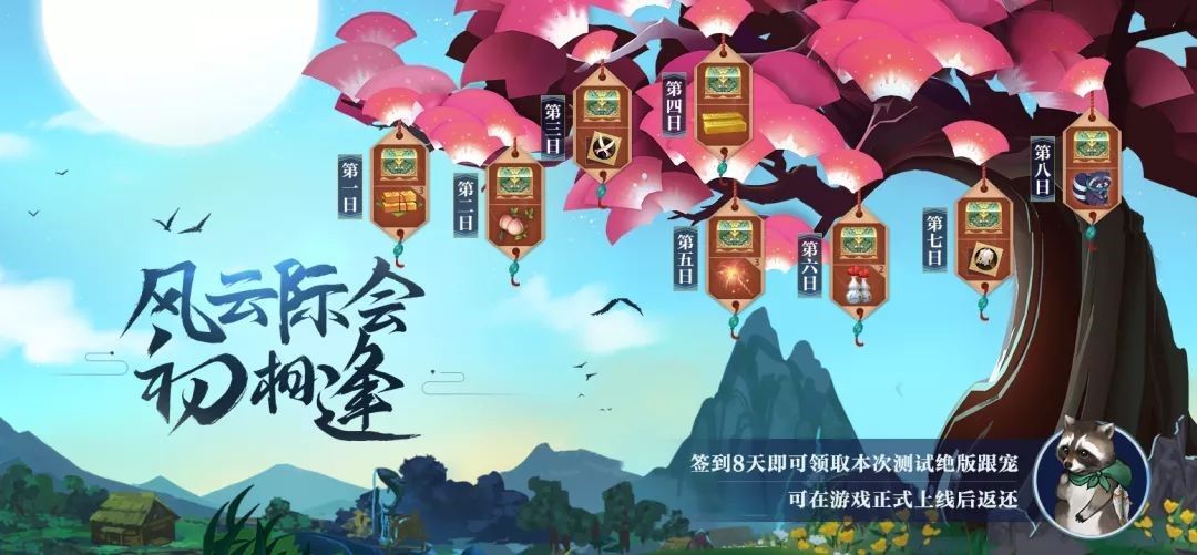 所有参与本次测试的少侠,签到即可领取本次测试专属限定跟宠——小浣熊【念念】,并且可以在不删档上线后,返还【跟宠·念念】原物,支持跨手机系统返还,少侠在本次安卓测试领取到的念念,可以于不删档之后登录同一账号在ios系统返还。念念会一直伴随在少侠身边哦!