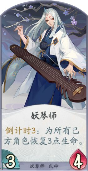 卡牌效果:使妖琴师的倒计时-3,是己方其他未气绝式神的倒计时-1