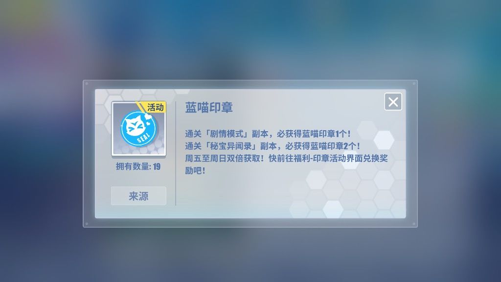 蓝色印章的获得:每通关一次剧情就能获得一枚蓝色印章,每通关一次“秘宝异闻录”就能获得两枚印章。所以我们可以将蓝色印章换算成体力就是:6点能力=1蓝色印章。