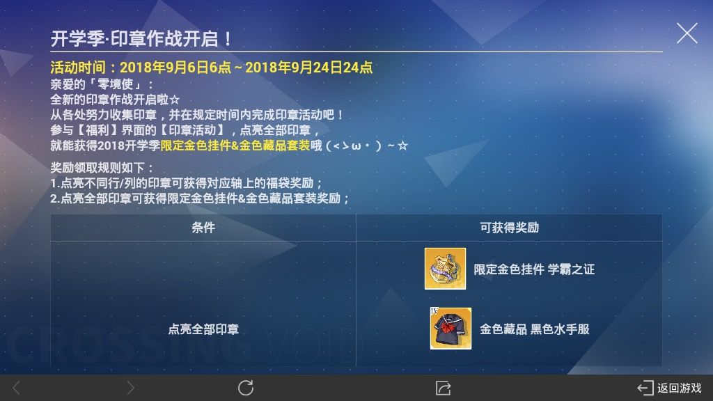大家好,我是Archery,在2018年9月史记级大片“开学”上映之后,零境交错贴心的为大家准备了开学季“印章作战”活动,并在活动中给出了有史以来第一件限定“金挂件”和两件限量版“金藏品”的优质奖励,同时在点亮不同徽章的同时,可以活动福袋中的各种奖励,大家是不是心动了呢?