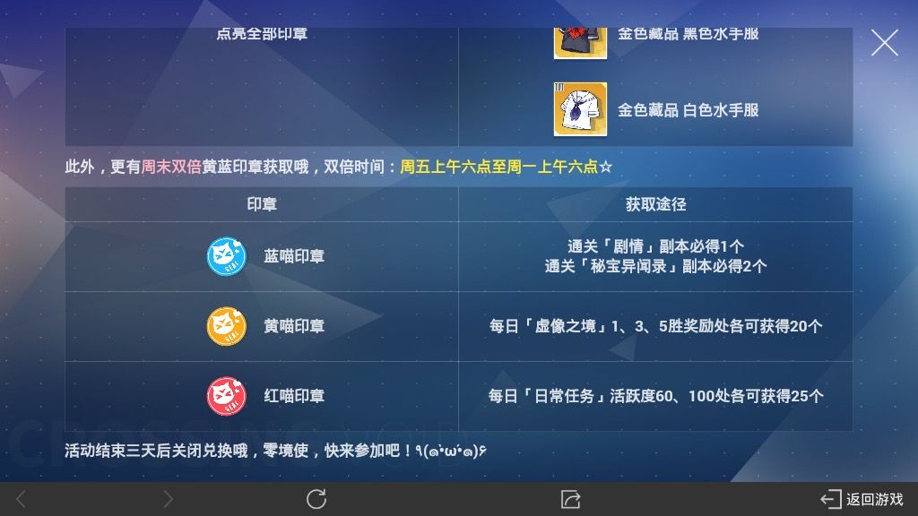 所以即使不买体力,最快5天就能轻松搞定500枚蓝色印章啦。