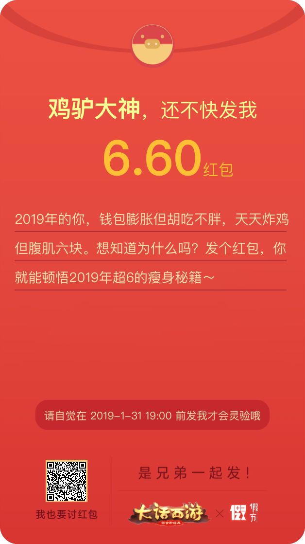 根据你与对方的不同关系,系统将会为你生成各种能够讨对方欢心的祝福语,长按图片保存就可以发送给朋友或者发布到朋友圈,保证独一无二,让你成为你朋友圈里的一股清流!有了这款大话为你量身定制的讨红包神器,再也不需要到处复制没有创意的新春祝福话语啦,赶紧把这个好消息分享给自己的好兄弟吧!同来抢红包,猪年一起发!事不宜迟,赶紧点击链接(扫描二维码),向你的亲朋好友们讨红包吧!