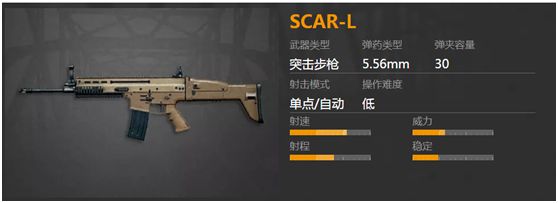 SCAR-L作为SCAR枪族中使用5.56 NATO的轻型版,是FHN为了满足美军特战司令部而制造的。这把枪在游戏中可以说是很抢手的,属性在步枪中,算是中规中矩。单发子弹在无护甲时威力41,一级甲28.70,二级甲24.60,三级甲18.45,无头盔102.5,一级头71.75,二级头61.50,三级头46.13,射程55,射速71,稳定性31。全自动射击时水平后座力较小,裸枪扫射枪口晃动在步枪中算的上最小,在加装了垂直握把以后,后坐力更微弱,可以说是最适合新手练习压枪的一把枪。射程方面,中距离压枪扫射能力极强,远距离点射就显得稍弱。其对敌时,子弹的低初速是其最大的不足,但在全自动模式下,SCAR-L的前二十发子弹着弹点最为密集,这就造就了SCAR-L在所有全自动步枪中,可以说是新手压枪对敌的首选武器。