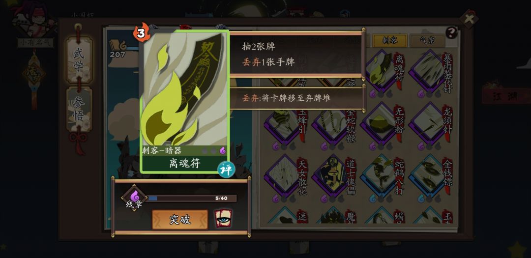 开局用离魂符把自带的针抽出来(全部针都要升级),用童姥的不老长春赋予回返,之后打光针后用离魂符抽卡并丢掉极阴神功,针重新回到手上。重复即可。