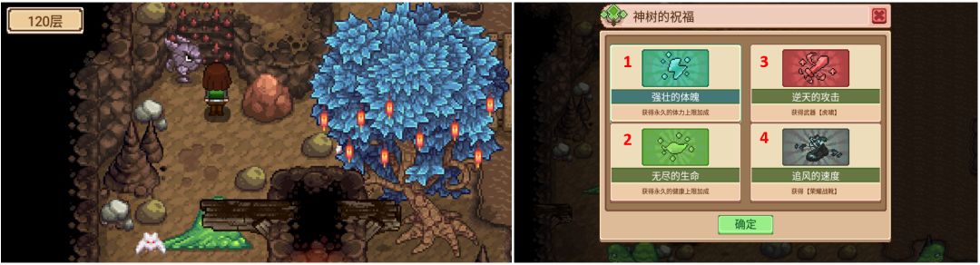 🗡达到底层-120层时,有颗神树,点击它出现神树的祝福选项(4选1)【鞋子比较好,至少这也是一个装备,在没拿到100层的鞋子前,还是很好用的】