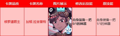 1. 修罗道君主技能装备的神器由+1/+1调整为+1/+0
