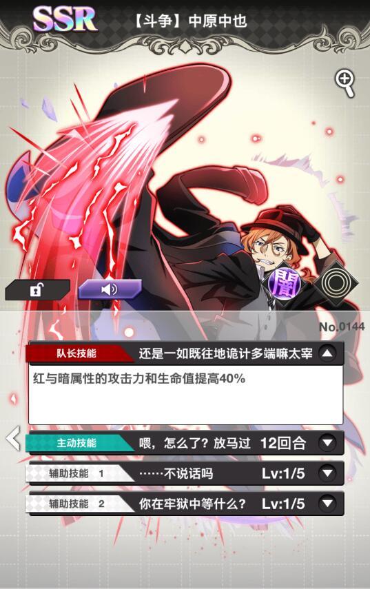 港口黑手党干部:中原中也。和过去隶属港口黑手党的太宰有一段很深的孽缘。在牢狱中和太宰口舌大战之后,重复应付着激烈的攻击。
