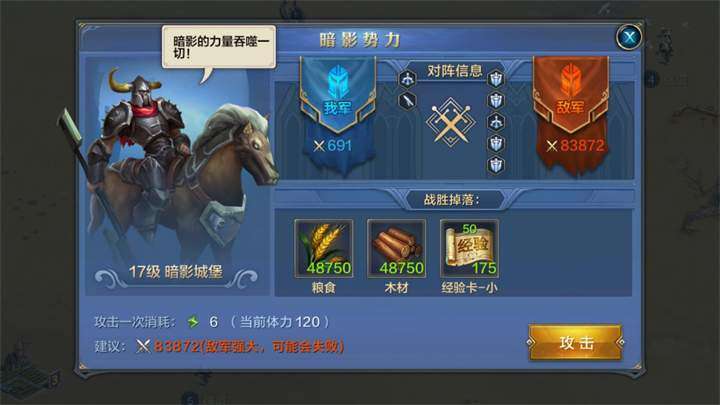 3.玩家可出兵攻击城堡,进行一次战斗,如果战斗成功,则获得一次战斗胜利奖励。战斗胜利后玩家可占领该黑暗城堡一段时间,在占领阶段每隔一段时间,该城堡会产出一定数量的资源,每个城堡都有产出资源的次数上限,次数耗光后,占领结束。
