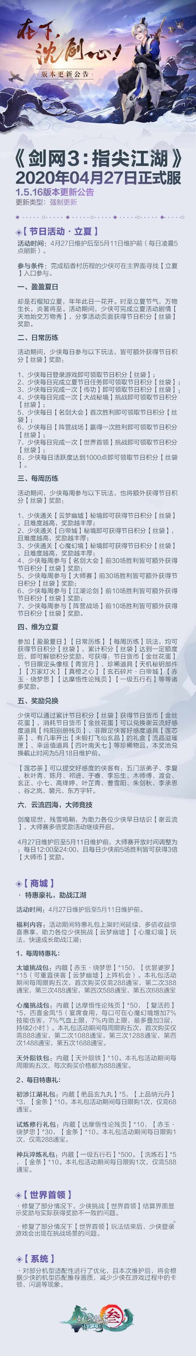 《剑网3:指尖江湖》4月27日更新公告来啦!