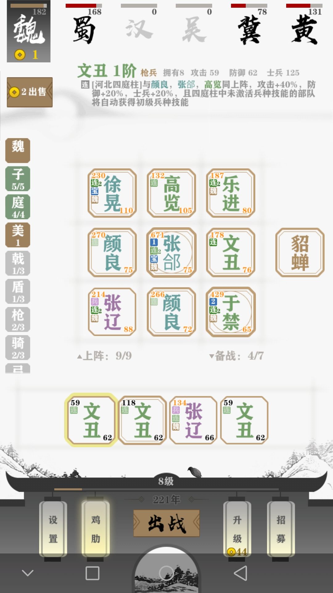 二级深绿张郃双阵营加成攻击力+40%再+40%自带弓箭放中心ADC完美弓箭输出(三级六百多输出),颜良自带突破,张辽强化突破和英雄技,这套阵营八人口就成型,唯一缺点就是升三级容易互相卡等级,更完美的是我出了2级吕布,2级貂蝉,8人口+吕布强化张辽突破能力,根本不会败的阵营