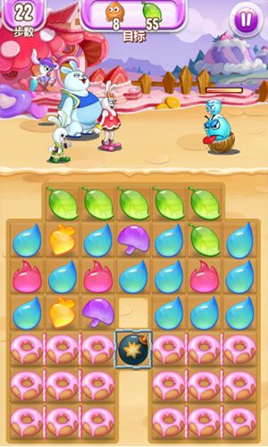 要求:22步内消除8个贪吃怪和55个绿色元素。