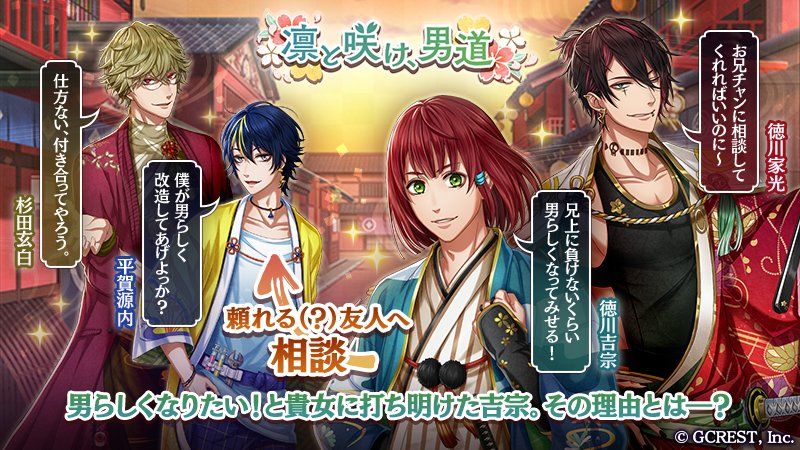 【あらすじ紹介】5/24(水)15:00から、新イベント『凛と咲け、男道』開催!家光に内緒で、「男らしくなりたい!」と決意した吉宗。貴女は玄白&源内と共に吉宗を手伝うことにするが――吉宗の決意が、思わぬ騒動を巻き起こす!?