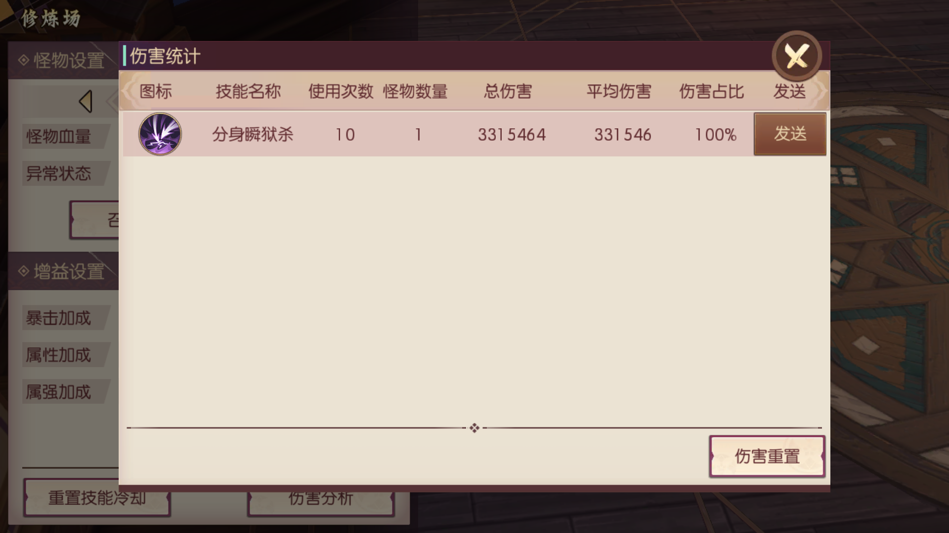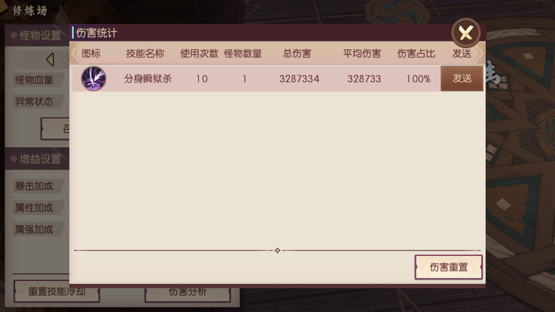 小弟不才就一平民但是人品可能比较好,岚峰桔梗断岗都出了,于是合计在0强的时候测试一下三个对技能伤害的提升,三个右槽都是0强32力的情况下测试天诛的分身瞬狱杀,结果如下图