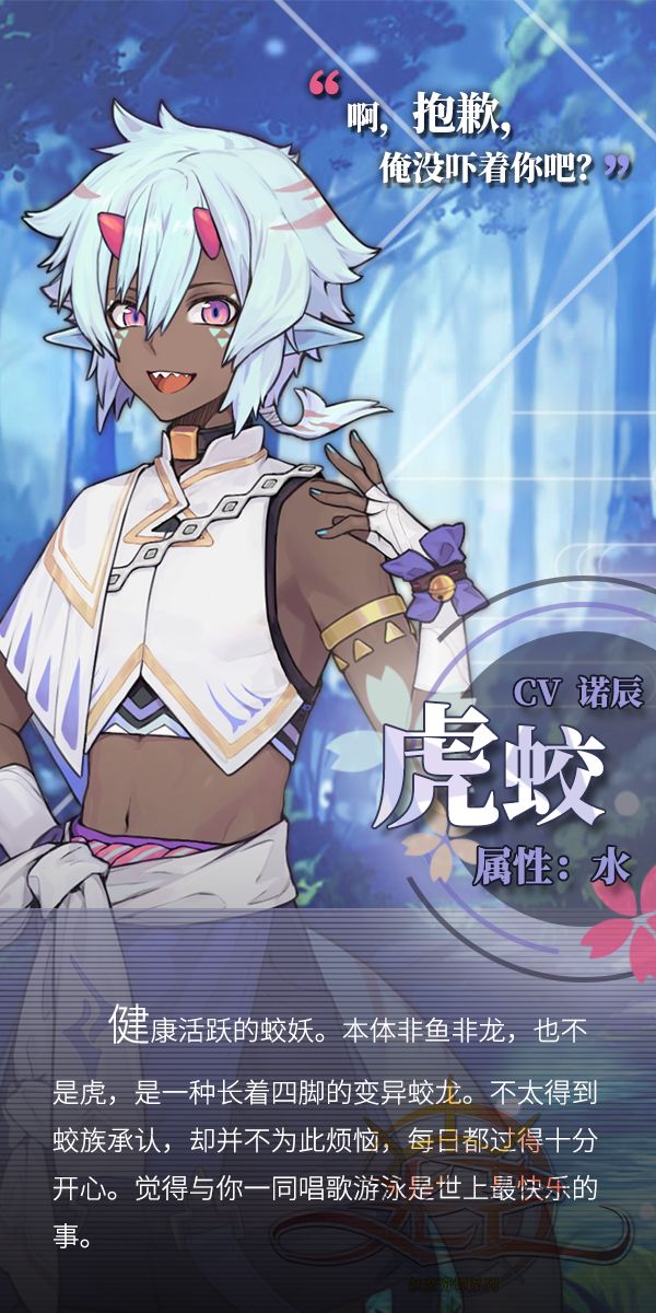 虎蛟是出自《山海经》的妖怪,百妖乡的虎蛟,有着黝黑的皮肤,性格豪爽大方,而且很认真,是个充满元气的少年……