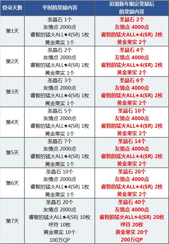 登录奖励共计可获得:圣晶石96个、呼符20枚、友情点28000点 、睿智的大火32枚、黄金果实32个、200万QP!