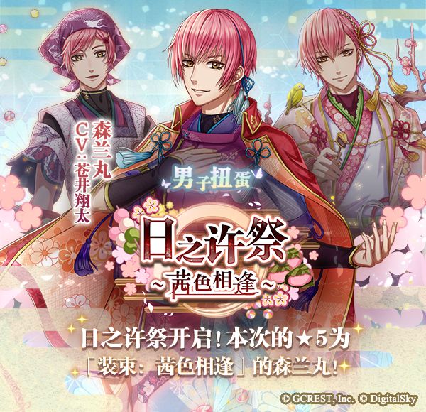 ※ 本次活动扭蛋中的5星男子为日之许祭限定的森兰丸(并且遇见☆5只会出现新登场森兰丸),活动结束后此男子将不会加入普通或其他活动卡池,请各位巫女大人知晓。