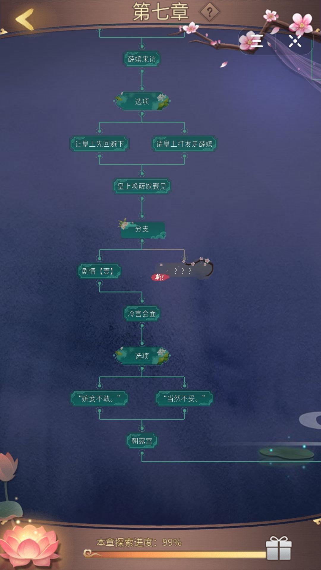 剧情树就剩下第七章这一点了,这个分支我试过好多次,每次第一章大地图选御花园,专门把薛嫔绕过去也没用。