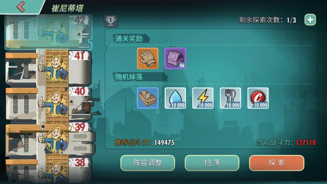 大型关卡除了副本就是崔尼蒂塔,玩家通过每层崔尼蒂塔会有装备和紫色配件加工材料以及随机一种4种工厂资源1万的奖励,每天免费挑战次数为3次,付费次数有两次,第一次50可乐,第二次100可乐,接下来几期笔者将会为大家讲诉崔尼蒂塔37到42层的攻略。