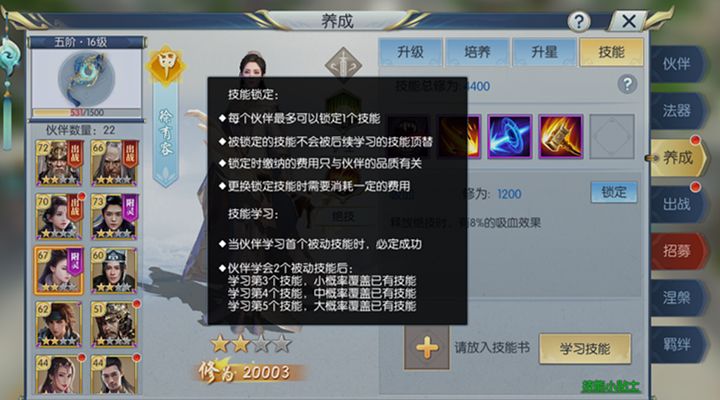 2、在技能学习的时候,可以选择绑定之前已经学会的的一个高级伙伴技能,因为假设自身已经学习了3个高级技能,还有两个低级技能等待覆盖,在学习的时候,绑定一个技能之后再学习,高级技能被覆盖的概率就是40%,而在之前则达到了60%。